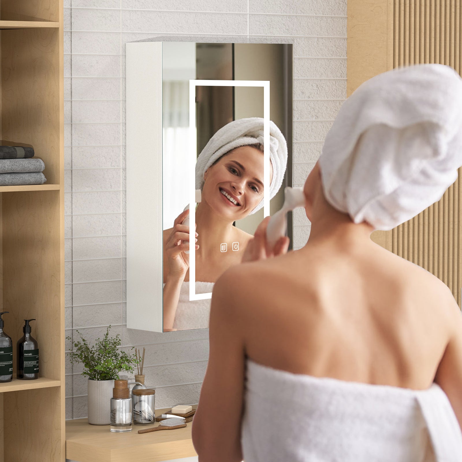 【Smart Bathroom Medicine Cabinet with Defogger】 Another touch sensor control for Anti-Fog ;The upgraded illuminated medicine cabinet increases the anti-fog area and effect .The separate anti-fog switch design makes this mirror cabinet for wall much safer and energy-saving .You can also use the vanity mirror medicine cabinet after taking shower ,helps to provide a clear reflection image. Lighted medicine cabinet with smart memory function and sensitive touch control.