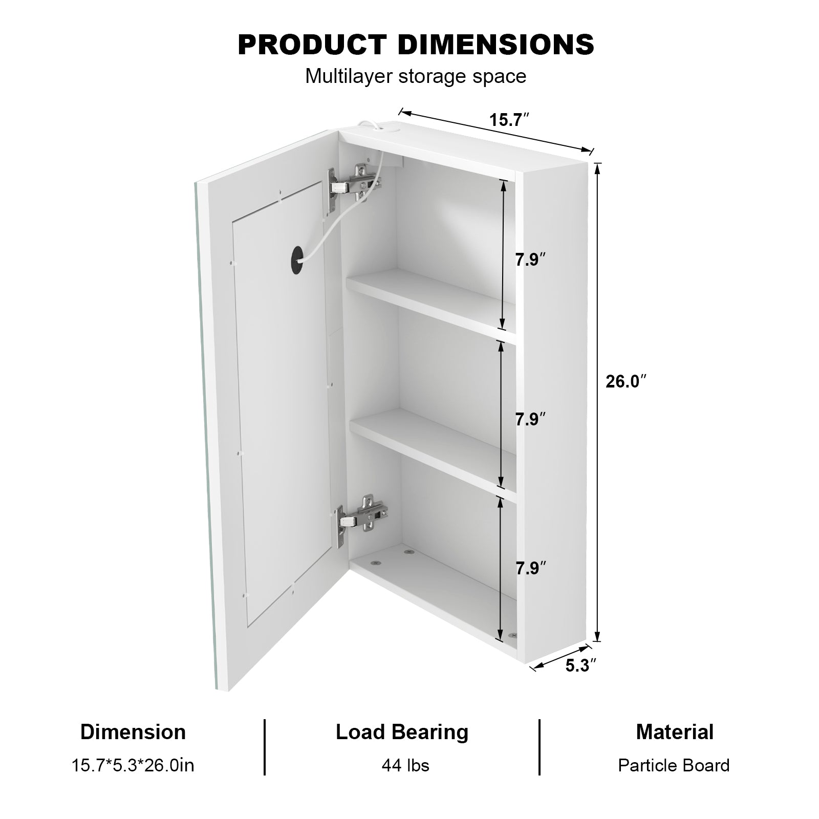 【Led Medicine Cabinet Mirror for Bathroom 】 Bathroom mirror cabinet is made of E1 grade particle board and copper-free silver mirror with LED light, high-quality material moisture-proof and waterproof, suitable for bathroom environment. MDF backplane for maximum stability. Size: 15.7x26 (inch), please measure the bathroom wall size before purchasing. The led medicine cabinet is an indispensable bathroom partner in your life.