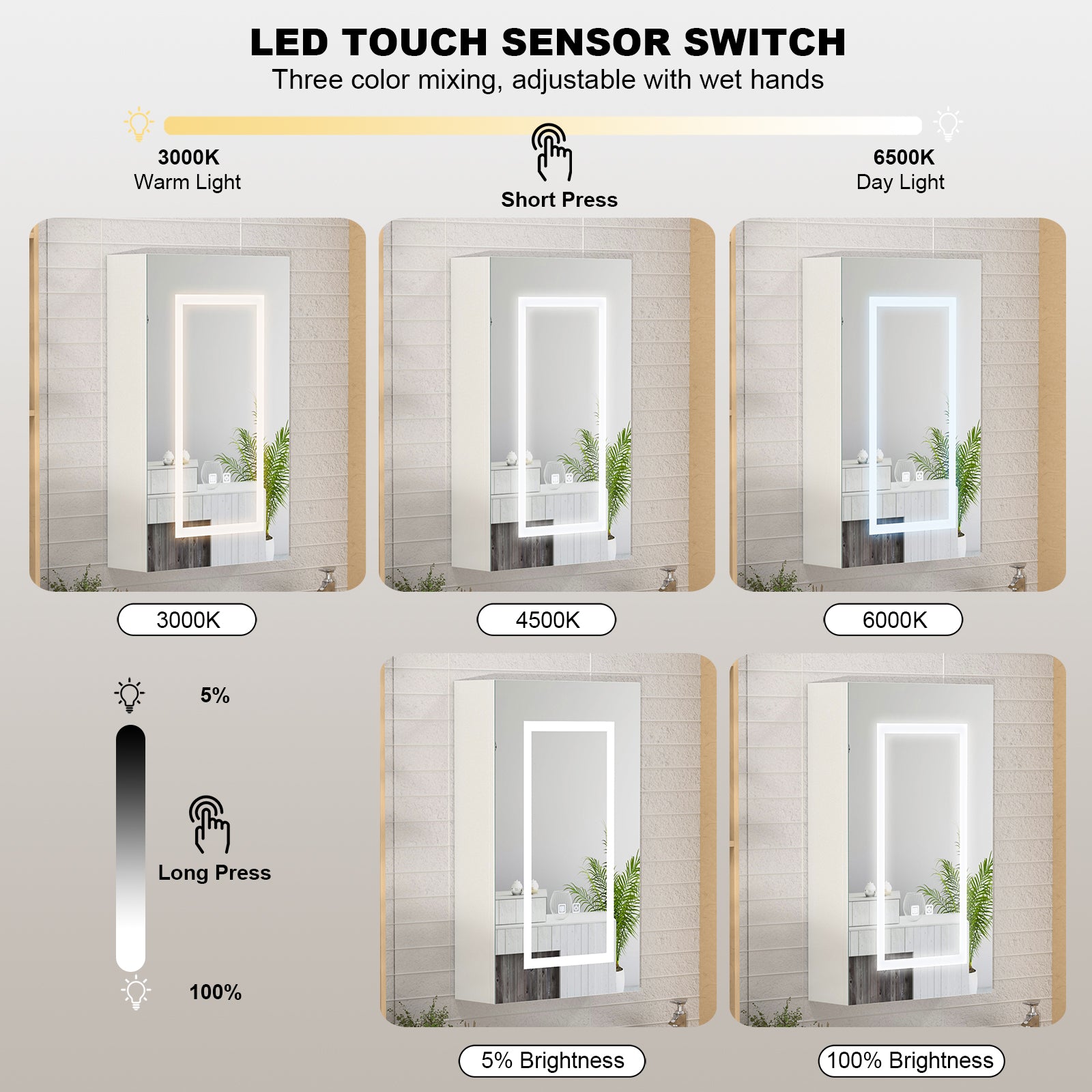 【Lighted Medicine Cabinet with Mirror】 This bathroom medicine cabinet has 2 smart touch sensor controls, one for the lighting adjustable ;Just click the LED sensor to operate the switch. Long press the button to adjust the intensity of the light, and short press to adjust the color of the light. There are 3 colors lights to choose from. Note: Led lights are only used as mood lights and cannot be used for lighting and cannot illuminate the entire bathroom.